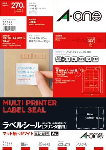 各種プリンタ兼用で印刷できる、上質紙素材のラベルシールです。「エーワン」の定番宛名、表示用ラベル。