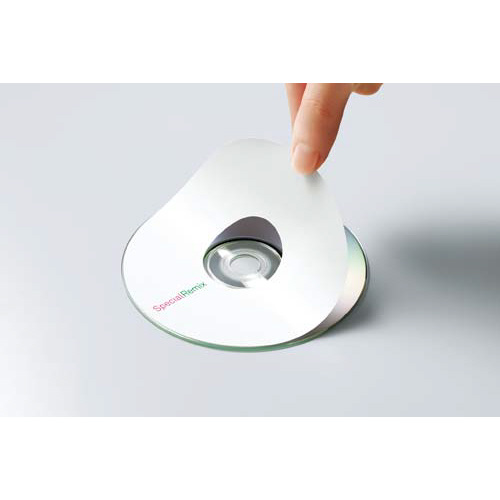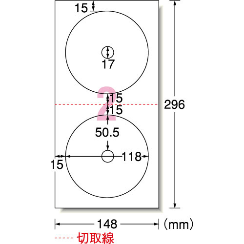 各種プリンタで印刷できるCDやDVD用のラベルシールです。大切なデータを分かりやすくきれいに整理できます。中央の切り取り線で切れば1枚から印刷できます。内径が小さいので広々とデザインできます。