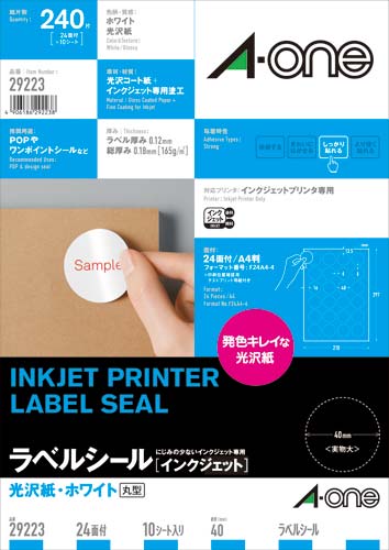 インクジェットプリンタ(IJP)で印刷できる、光沢紙素材のラベルシールです。写真やイラストを色鮮やかに印刷できます。パッケージラベル、ギフト、ラッピングシール作成に。
