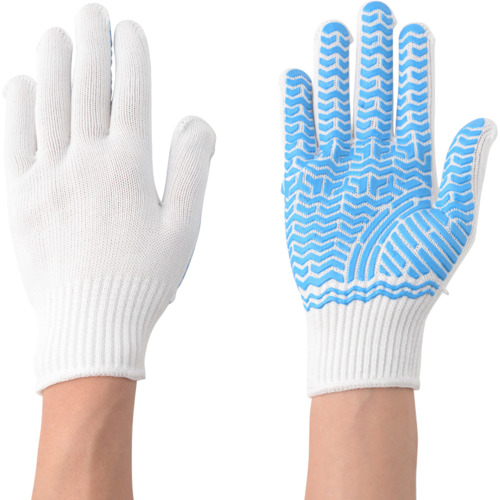 編み手袋に手のひらの動きを考慮したライン状の天然ゴムを配置したすべり止め手袋です。