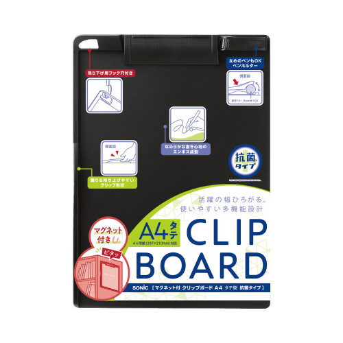 抗菌加工を施したA4サイズタテ型で、超強力マグネット付タイプのクリップボードです。JISZ2801に準拠した試験で抗菌効果が確認された素材(無機系抗菌剤)を使用しております。