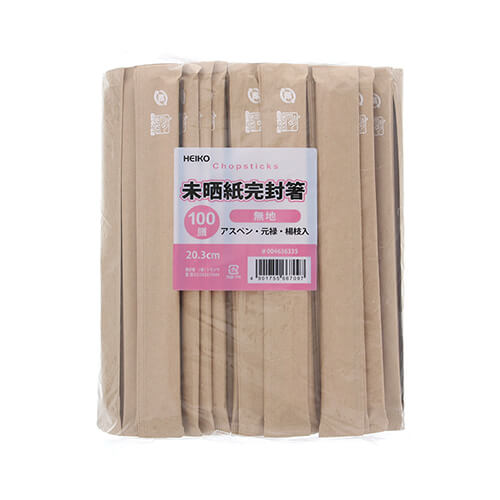 未晒紙袋に入った木肌が白く清潔感のあるアスペン材の楊枝入り紙完封割箸(業務用パック)。カフェ等でもお使いいただけるクラフトのナチュラル感がおすすめです。サイズは4.5×203mmです。