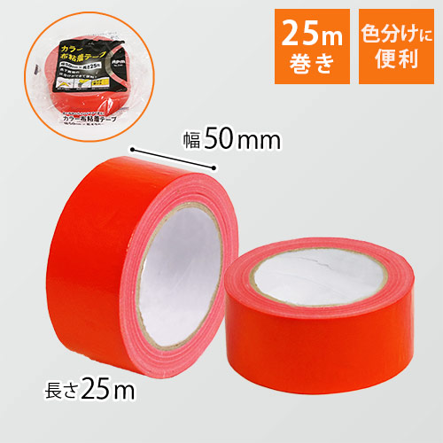 25m巻きの布カラーテープ(赤)です。手で簡単にカットできるので、作業効率が良いです。