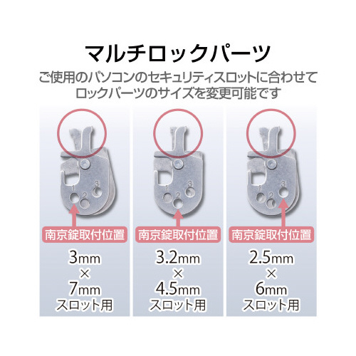 ●セキュリティスロットサイズ/標準スロット(3×7mm)、MiniSaver(3×7mm)、NanoSaver(2.5×6mm)、NobleWedge(3.2×4.5mm)※スロットサイズが対応していても、機種によってスロット内部の奥行が対応しない場合がございます。