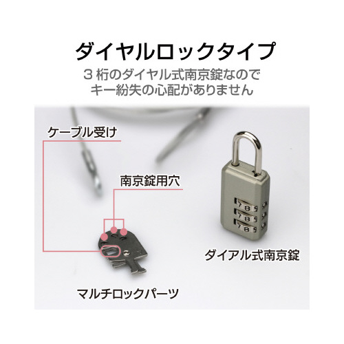 薄型ノートパソコン・液晶モニタ・タブレットに最適。セキュリティスロットにセットすることで、盗難から守るダイヤル錠タイプのマルチセキュリティワイヤーロック。