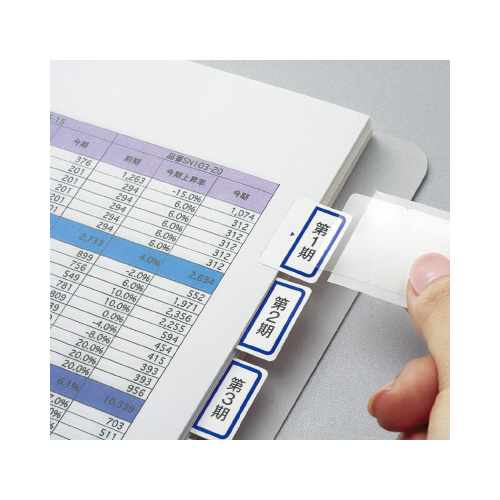 折り目に沿って位置合わせができるから、簡単・キレイに貼れる。マルチプリンタ対応の強粘着タイプ(保護フィルム付き)のタックインデックスです。