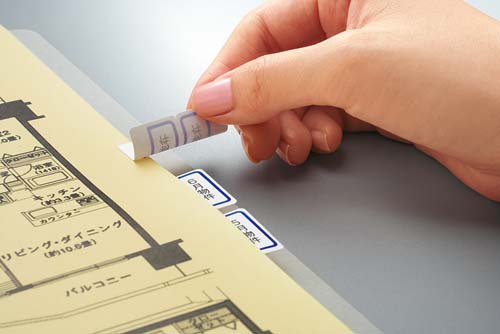 折り目に沿って位置合わせができるから、簡単・キレイに貼れる。マルチプリンタ対応の再はく離タイプのタックインデックスです。