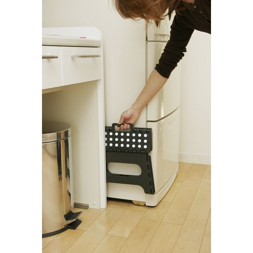 ちょっと高い所にも手が届くセノ・ビー。滑り止めラバー付なので滑りにくく、床なども保護してくれるのでフローリングで使用も可能。持ち手を引き上げるだけで、簡単にコンパクトにたためるので隙間に収納できます。
