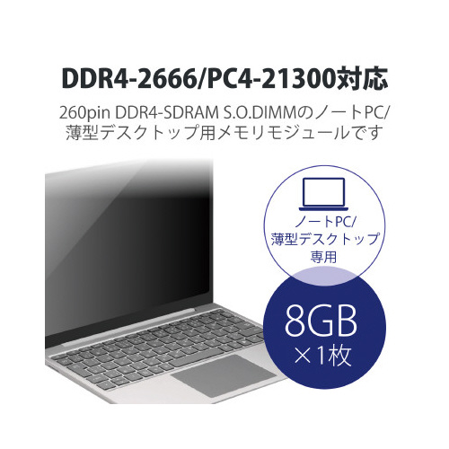 DDR4-2666/PC4-21300に対応した260pinDDR4-SDRAMS.O.DIMMのノートPC/薄型デスクトップ用メモリモジュール。「RoHS指令」に準拠。