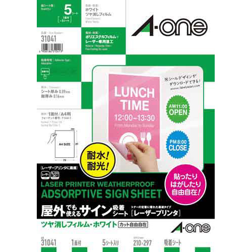 レーザープリンタ(LBP)で印刷できる、屋外でも使えるフィルム素材の吸着シートです。耐水性、耐光性に優れています。貼りなおしが簡単で、繰り返し使えます。ガラスに貼る掲示物作成に。