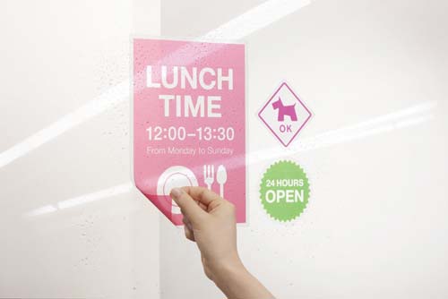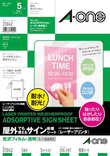 レーザープリンタ(LBP)で印刷できる、屋外でも使えるフィルム素材の吸着シートです。耐水性、耐光性に優れています。貼りなおしが簡単で、繰り返し使えます。ガラスに貼る掲示物作成に。