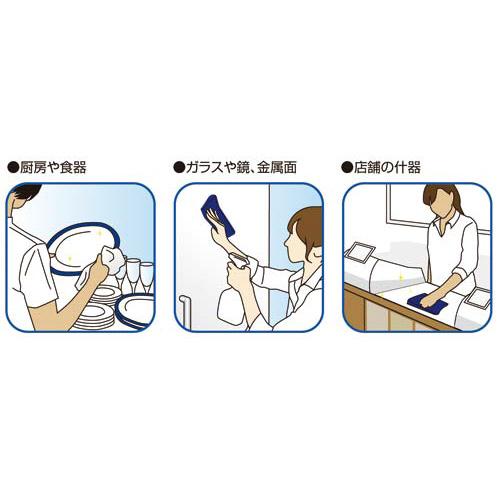 拭き跡が残りにくく、磨き上げにおすすめの飲食店向けふきんです。極細繊維のマイクロファイバーが汚れをかき取ります。食器の拭き上げ、ガラスや鏡の磨き上げ、厨房の油汚れの拭き掃除などに最適。
