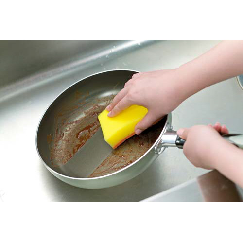 ウレタンスポンジと、研磨粒子付きナイロン不織布の貼り合わせスポンジです。握りやすい波型カット。コゲ、こびりつき、油汚れ、茶しぶまで落とします。