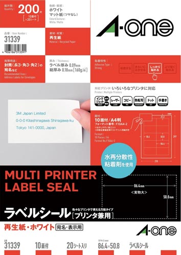 グリーン購入法適合商品。各種プリンタで印刷できる、再生紙素材のラベルシールです。ラベル、台紙共に古紙パルプ配合率100%の再生紙を使用しています。宛名ラベル・表示ラベル作成に。