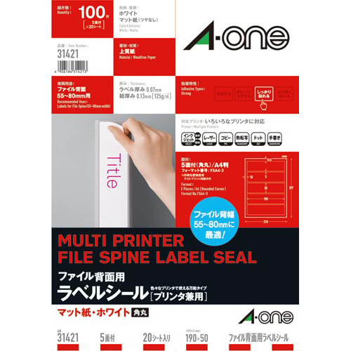 各種プリンタ兼用で印刷できる、上質紙素材のファイル背面用ラベルシールです。ファイル背幅55mmから80mmに最適なラベルサイズ。