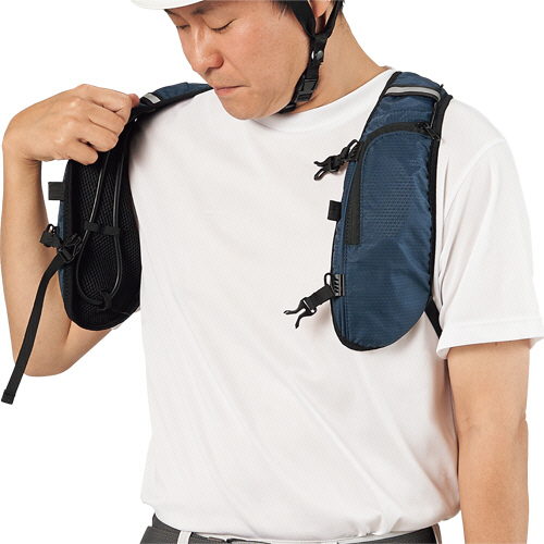 ●着用前に背中のタンクに150mlの水と凍らせたペットボトルを入れるだけ。ポンプで冷えた水を循環させて体を冷やす構造。