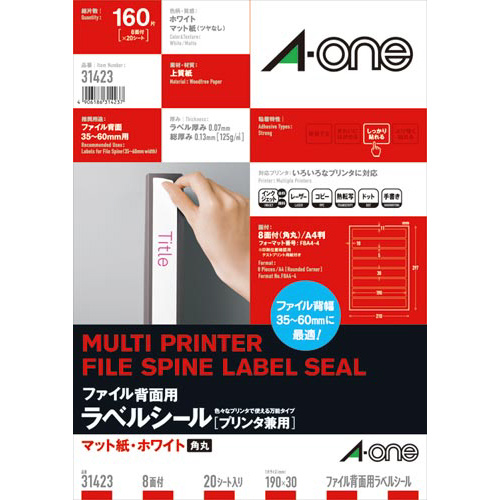 各種プリンタ兼用で印刷できる、上質紙素材のファイル背面用ラベルシールです。ファイル背幅35mmから60mmに最適なラベルサイズ。