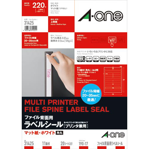 各種プリンタ兼用で印刷できる、上質紙素材のファイル背面用ラベルシールです。ファイル背幅20mmから35mmに最適なラベルサイズ。