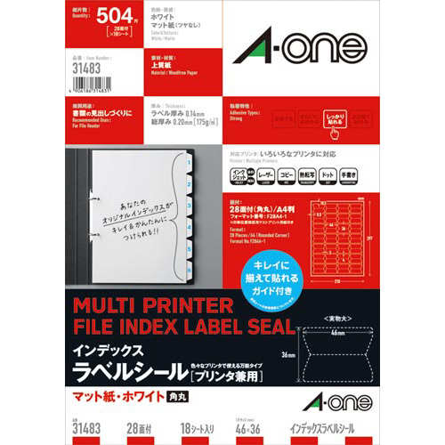 各種プリンタ兼用で印刷できる、厚口の上質紙を使ったインデックスラベルシールです。書類の分類、見出しの作成に。インデックスの山をきれいに揃えて貼れる等間隔ガイド付。