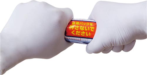 汚染物の付着した箇所の洗浄・除菌に。次亜塩素酸ナトリウム液の入ったパックを上からひねりつぶして開封するだけで、容易に使うことができ便利です。
