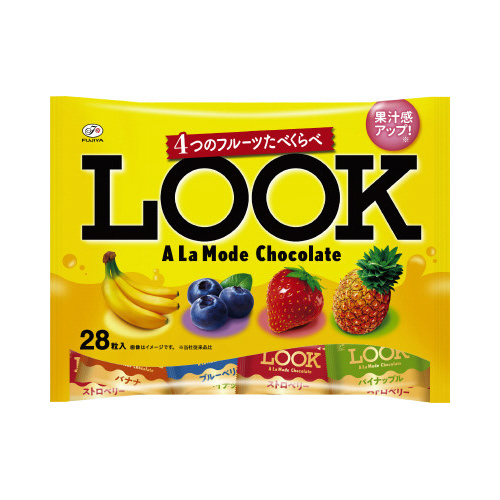 「バナナ」「ブルーベリー」「ストロベリー」「パイナップル」の個性豊かな4つの味わいのセンタークリームをミルクチョコレートで包んだ、ロングセラー「ルック」の定番人気商品。