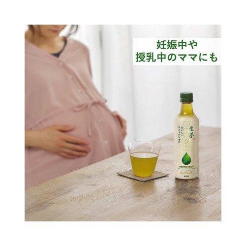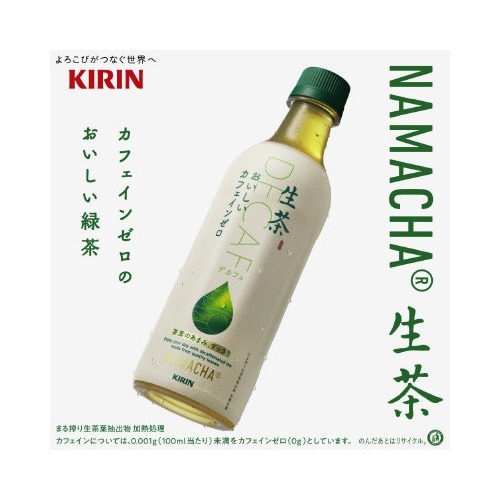 「人と社会と、やさしく調和する生茶」人にやさしい、カフェインゼロの緑茶。環境にやさしい、R100ボトル。(再生PET樹脂100%のペットボトルを使用)