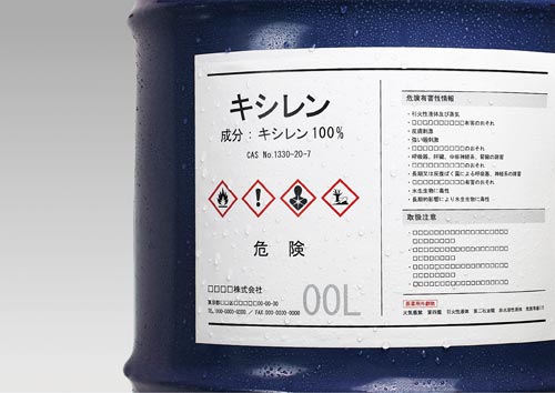 法改正による化学品のラベル表記の変更にすばやく対応。レーザープリンタ(LBP)で印刷でき、異なる内容のラベルも少ロットで必要な時に必要な分だけ印刷できます。水に強い耐水紙を使用しています。