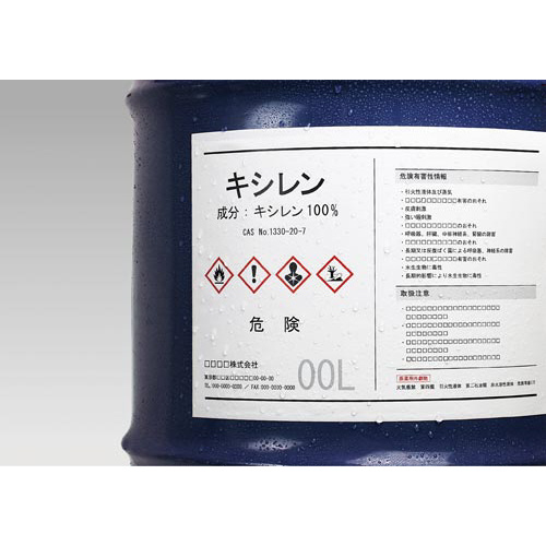 法改正による化学品のラベル表記の変更にすばやく対応。レーザープリンタ(LBP)で印刷でき、異なる内容のラベルも少ロットで必要な時に必要な分だけ印刷できます。水に強い耐水紙を使用しています。