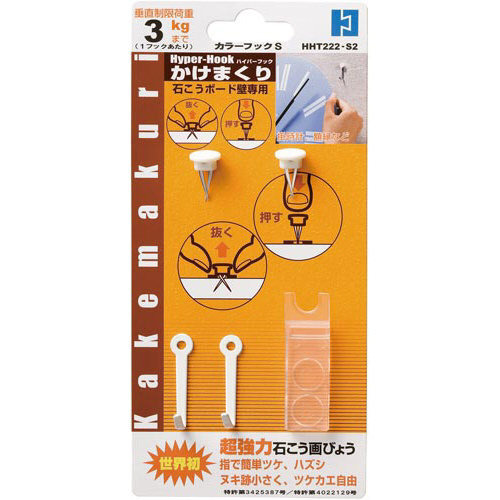 軟らかな石こうボードにしっかり固定。抜き跡は画びょうサイズの大きさで目立ちません。場所をかえて、繰り返し使用できます。