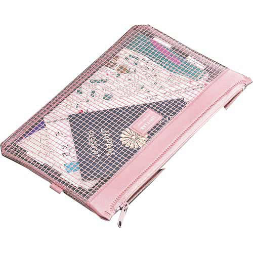 メッシュの入った透明素材の丈夫なケース。透明素材なので中身が一目瞭然。吊り下げ用フック付きで、保管にも便利です。