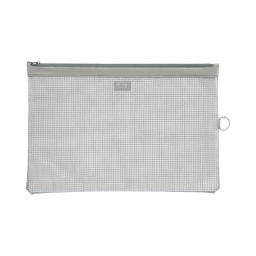メッシュの入った透明素材の丈夫なケース。透明素材なので中身が一目瞭然。吊り下げ用フック付きで、保管にも便利です。