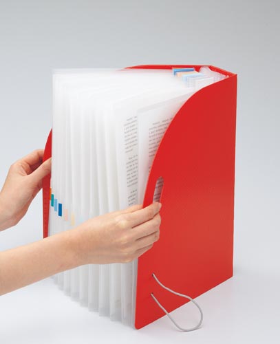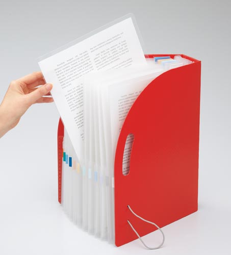 分類・検索性に優れたジャバラタイプのボックスファイル。卓上では大きく広げて使え、しまう時はスッキリ収納。