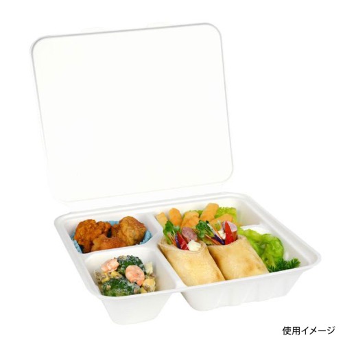 主原料のバガス(サトウキビの搾りかす)と竹の混合素材を使用したホワイト基調の業務用・使い捨てランチボックスです