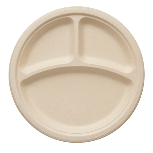 プレーンな円形プレートタイプ、3つの仕切り付き。サイズは約径25.4×高2.5cmです。