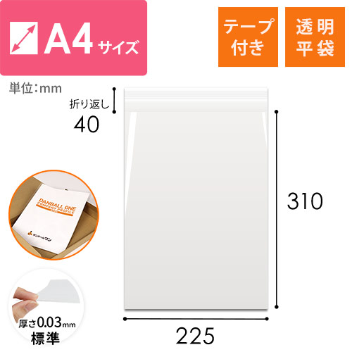 「OPP-A4T」は、A4サイズ対応のテープ付きOPP袋。