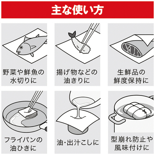 ●二層構造Hシートにより、水・油・ドリップをたっぷり吸収する不繊維タイプのクッキングペーパー。天然パルプ使用。