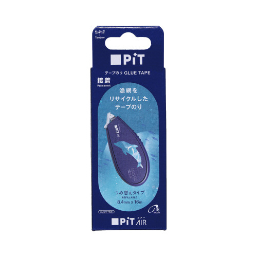 最後まで驚くほど軽く引ける「ピットエアー」シリーズ。使い終わった漁網をリサイクルしたテープのり。役目を終えた漁網が再生ナイロンになり、テープのりの上部ケースに生まれ変わりました!