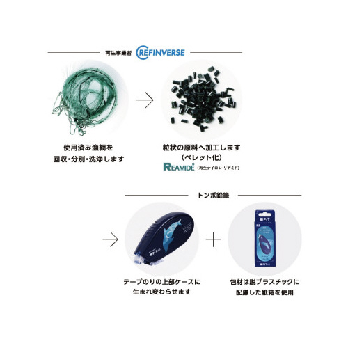 最後まで驚くほど軽く引ける「ピットエアー」シリーズ。使い終わった漁網をリサイクルしたテープのり。役目を終えた漁網が再生ナイロンになり、テープのりの上部ケースに生まれ変わりました!