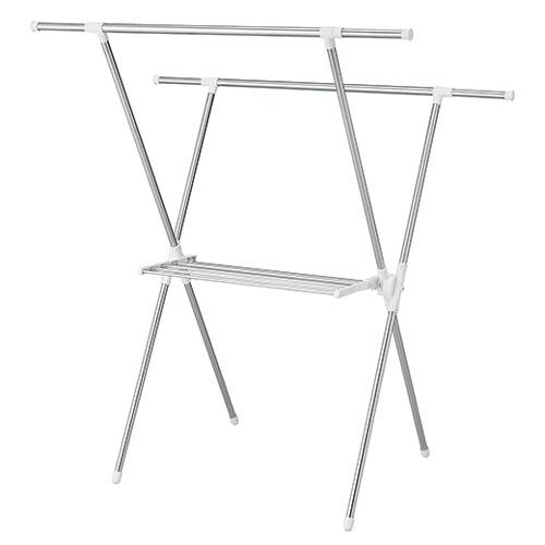 使いたいときにサッと広げて部屋干しできる!便利な室内物干しスタンド。サビにくいステンレス巻仕様。