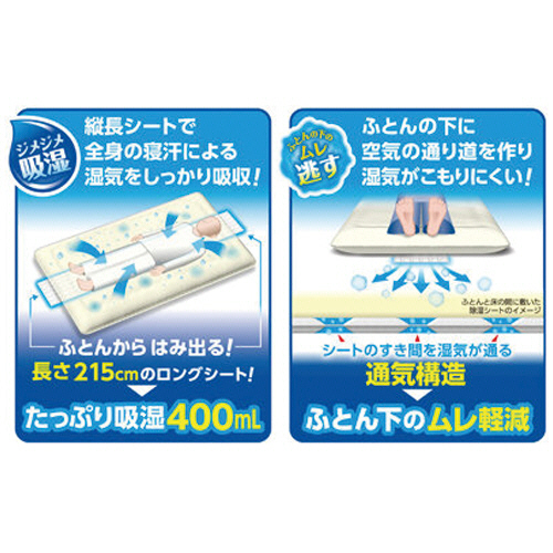 ●たっぷり吸湿400mL。縦長シートで全身の寝汗による湿気をしっかり吸収!