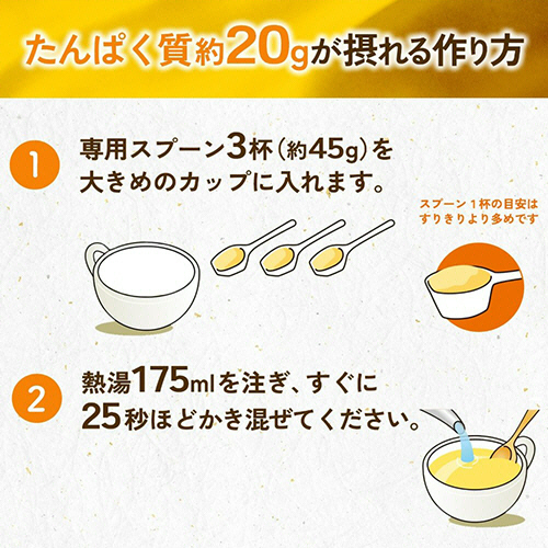 ●調理方法/専用スプーン3杯(約45g)を大きめのカップに入れ、熱湯175mlを注ぎ、すぐに25秒ほどかき混ぜてください。