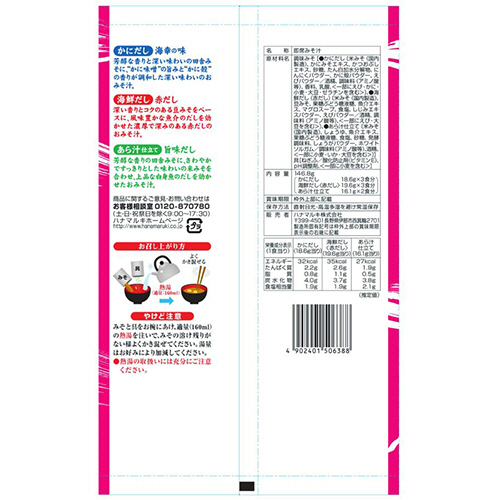 ●栄養成分/[かにだし]たんぱく質:2.2g、脂質:0.8g、炭水化物:4.0g、食塩相当量:1.9g [海鮮だし]たんぱく質:2.6g、脂質:1.1g、炭水化物:3.7g、食塩相当量:1.9g [あら汁仕立て]たんぱく質:1.9g、脂質:0.5g、炭水化物:3.8g、食塩相当量:2.1g