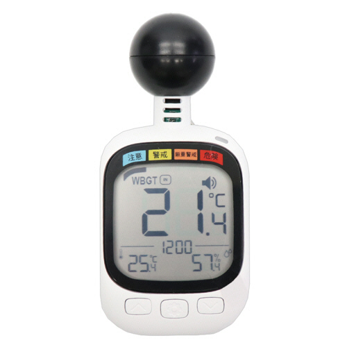 ●酷暑環境下での行動に伴うリスクの度合いを「注意」「警戒」「厳重警戒」「危険」で表示する、黒球式熱中指数計。
