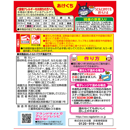 ●離乳食の終わった1歳頃から。アンパンマンミニパックカレー、ポークあまくちです。小さいお子様に適量のサイズ(50g×2袋)です。