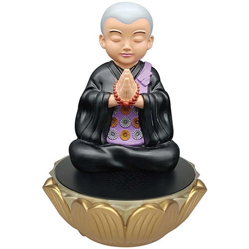蓮型の台座から読経が流れ、かわいいお顔の小さなお坊さんと一緒に毎日のおつとめを。
