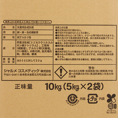 ●成分/界面活性剤(22% ラウリルスルホン酸ナトリウム)、工程剤(硫酸塩)、アルカリ剤(炭酸塩、けい酸塩)、水軟化剤、蛍光増白剤、漂白剤、酵素