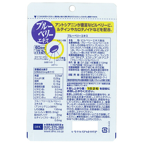 ●栄養成分(2粒あたり)/ブルーベリー(ビルベリー)エキス末(アントシアニン36%):170mg、総カロテノイド:2mg、ルテイン(フリー体として):0.6mg、ビタミンB1:2mg、ビタミンB2:0.4mg、ビタミンB6:2mg、ビタミンB12:40μg、シソの実油:156mg(α-リノレン酸として85.8mg)、たんぱく質:0.25g、脂質:0.18