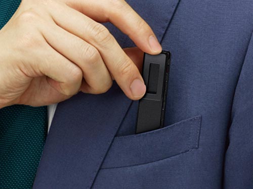 小さくて軽い、薄さ7.5mmのスティック型デザイン。さりげなく、スマートに録音できるICレコーダー