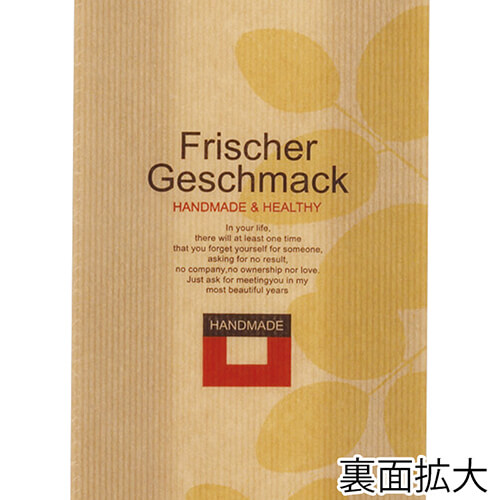 フィルムと紙を貼合した素材を使用したガゼット袋ですが、正面の一部分が透明フィルムのみになっているため、内容物を見せて包装できます。空気穴が開いているため、焼きたてのパンを入れてもくもりません。サイズは幅100×高605(横ガゼット40)mmです。