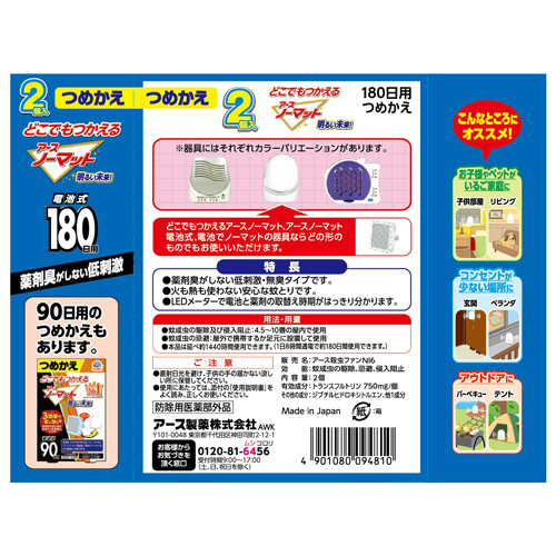 ●薬剤と電池の残りがひと目でわかるLEDメーター付、アースノーマット電池式180日用、つめかえ2個入です。